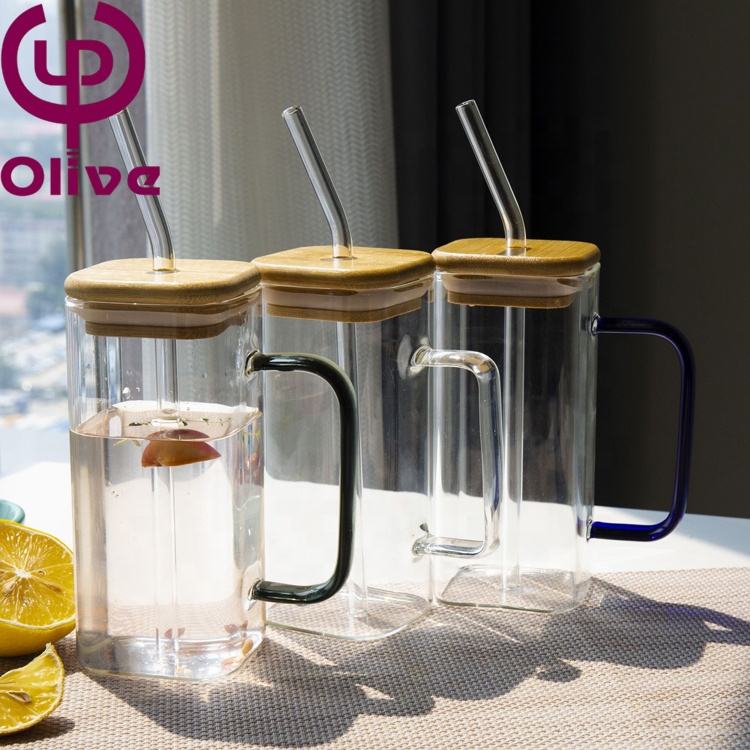 Modern Design Heat-Resistant Glass Tea Cup with Color Handle Square Juice Cup for Household Drinking Microwave Breakfast Cup