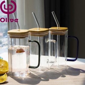 Modern Design Heat-Resistant Glass Tea Cup with Color Handle Square Juice Cup for Household Drinking Microwave Breakfast Cup